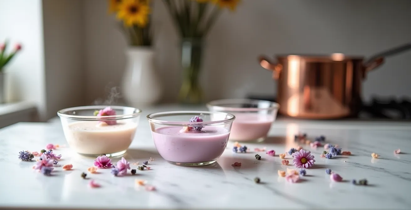 La pâtisserie Cokoa, experte en créations florales, parle de « matrice de diffusion ». Elle privilégie l’eau florale pour les mousses froides qui demandent une intégration immédiate, et réserve les pétales séchés aux crèmes cuites. Pour ces dernières, l’infusion lente dans le liquide chaud permet une extraction optimale et contrôlée des arômes, minimisant le risque de surdosage.