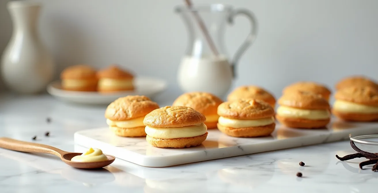 Pour garnir des choux destinés à un buffet ou une pièce montée, la question de la tenue à température ambiante devient primordiale. Deux grandes préparations s’affrontent : la crème diplomate et la ganache montée. La crème diplomate est une crème pâtissière collée à la gélatine et allégée avec de la crème fouettée. Sa texture est incroyablement aérienne et fraîche, mais sa stabilité est son talon d’Achille. La gélatine commence à perdre son pouvoir gélifiant dès que la température dépasse 18-20°C, rendant la crème molle et fragile.